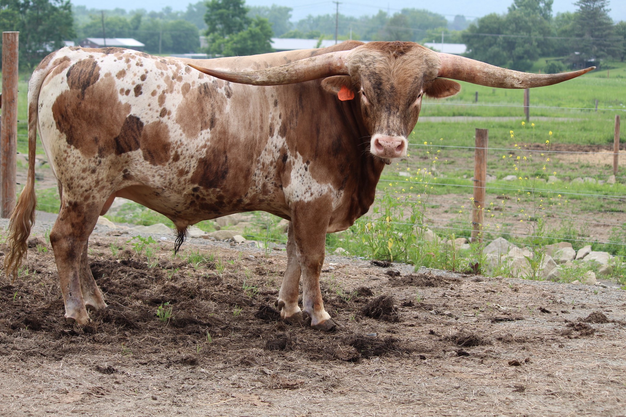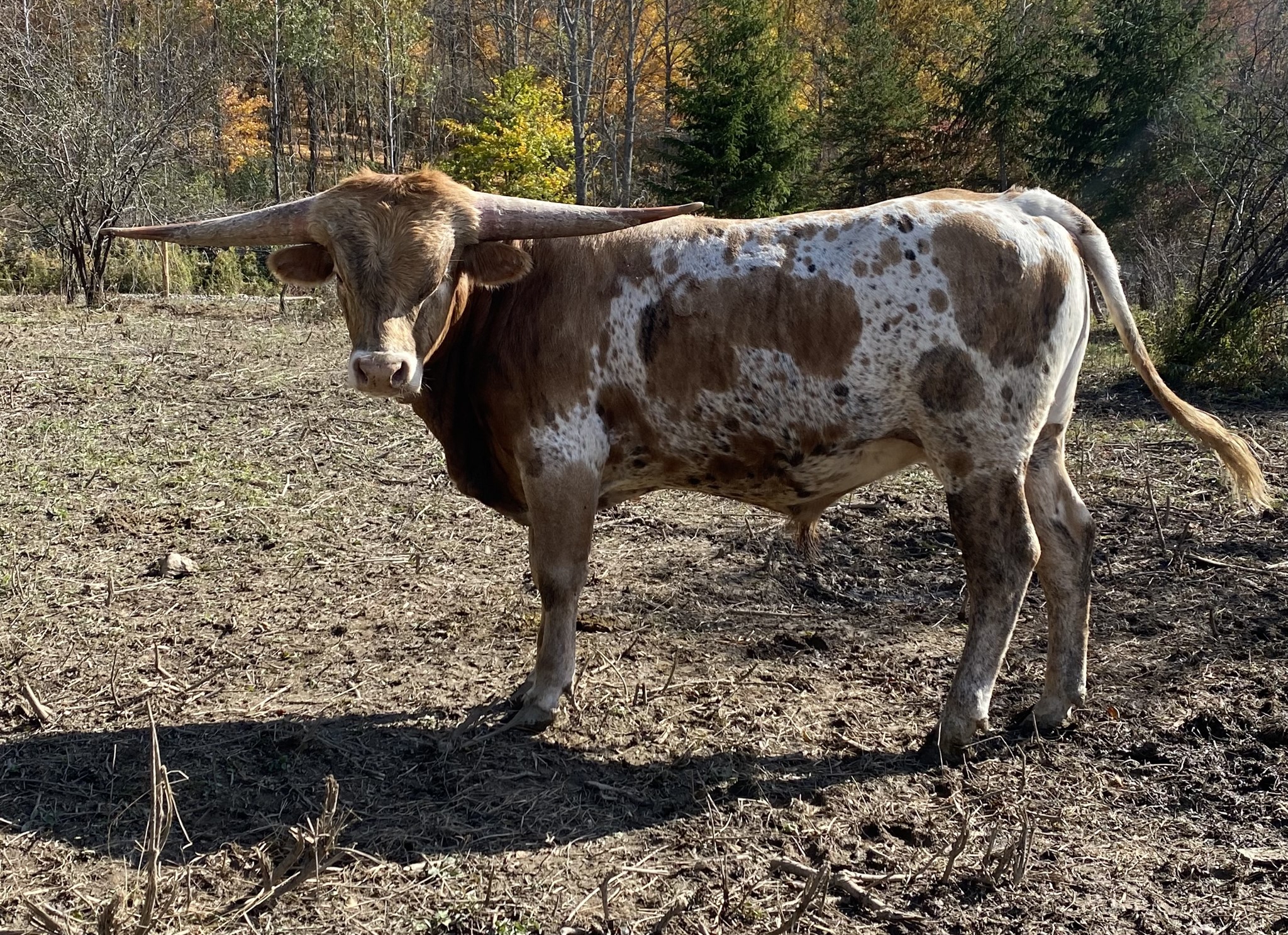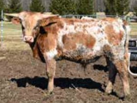 Bojangles, is one of those animals that you just get excited thinking about. As he has the potential to be something great! His is a big, strong bodied bull with the color to back it up. His sire is MC Hangin” Tuff who was the second bull ever to hit 100” TTT, which speaks for itself. Bojangles’ dam is M.C. Bertha, a big bodied, correct cow full of color that passes the color to her calves. That color comes from her sire MC Super Rex. A bull well known for throwing colorful, correct calves, producing multiple 80”, a few 90”, and even the 105” Rex’s Red Rose who is the sixth largest TTT cow in the breed. With all of that being said, how can we not be excited about this young bull? We put him on our two best heifers last year and can’t wait to see what he does with them. We are already talking about what girls we are going to put with him this year. We are hoping he brings color and conformation to our herd, while also adding some TTT.